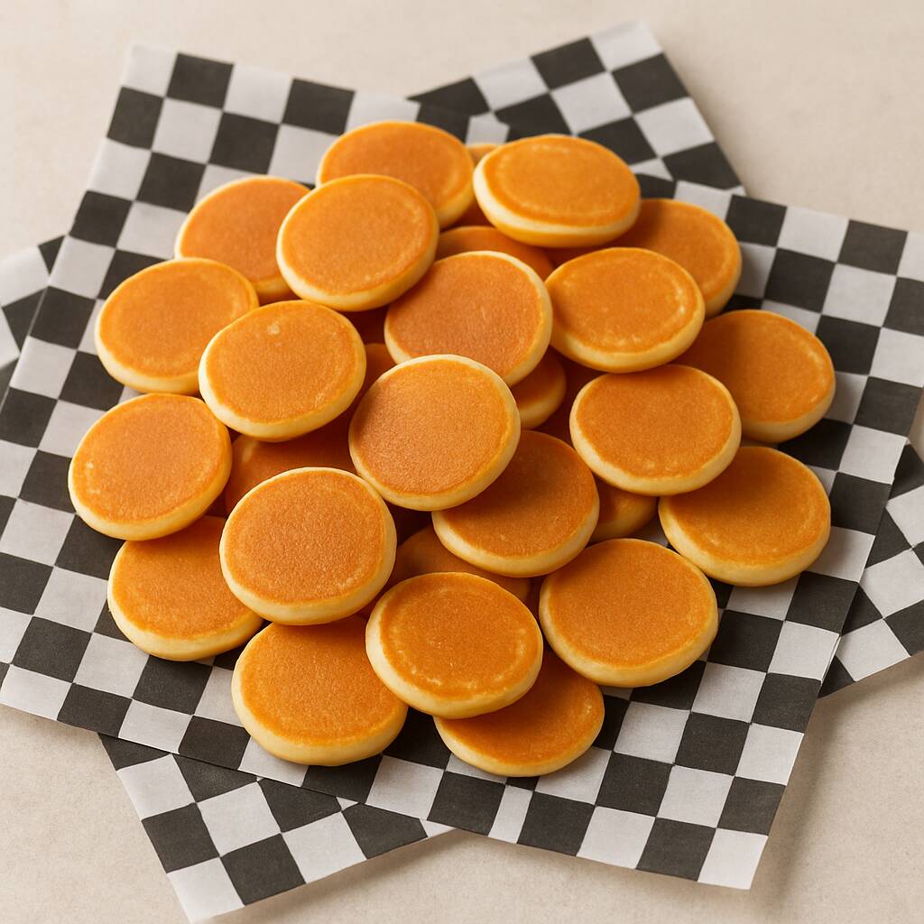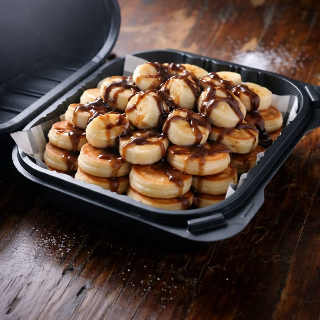 18 mini hotcakes recién hechos con dos toppings a elegir, ideal para compartir 🥞