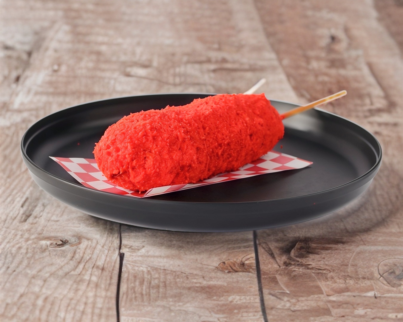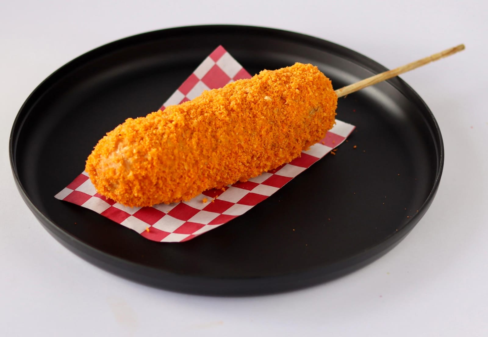 Banderilla coreana con relleno de salchicha y queso cubierta de panko y flamin hot.