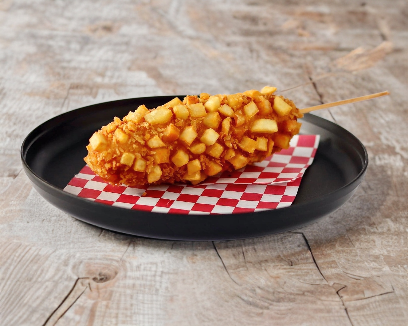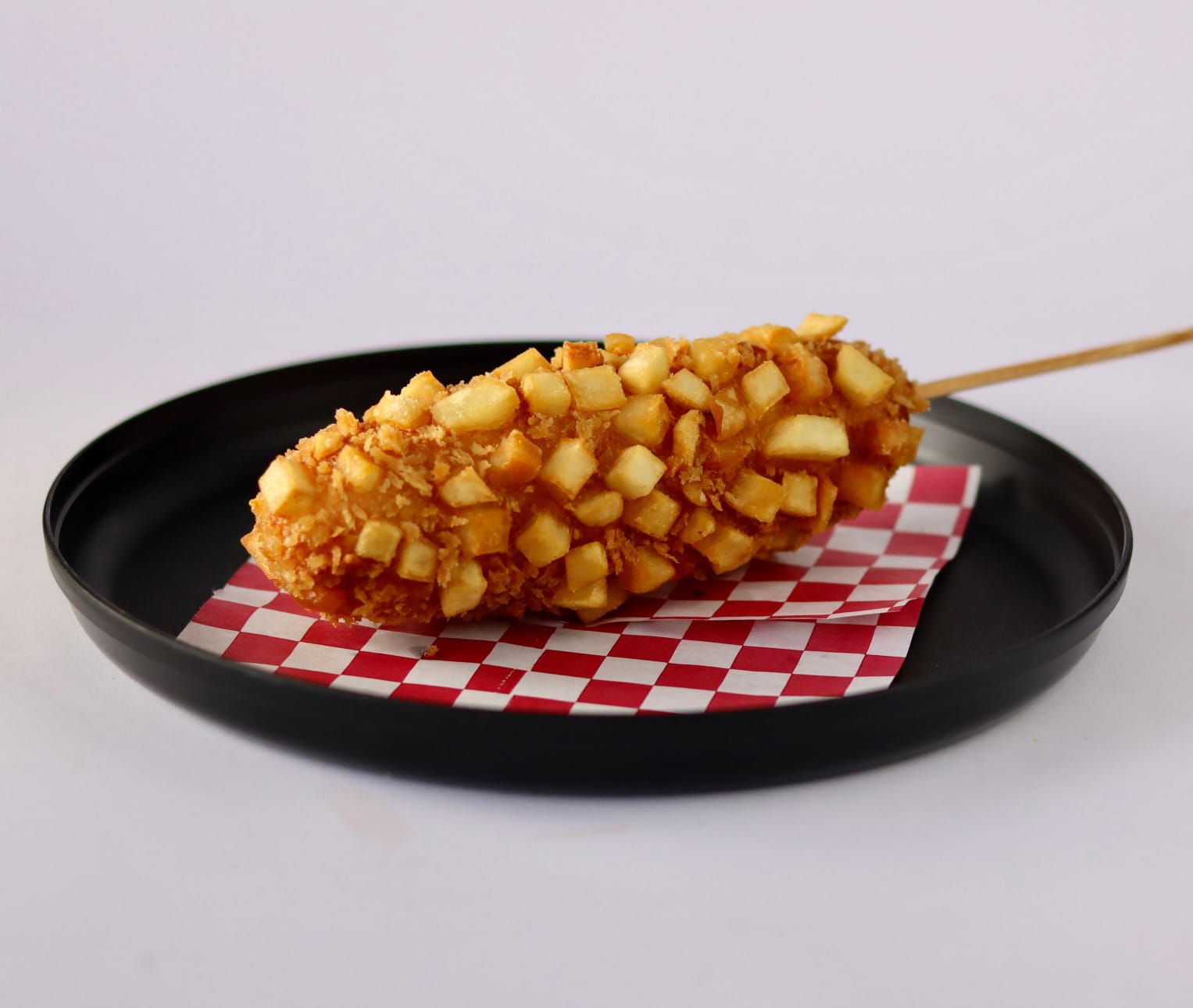 Banderilla coreana con relleno de salchicha y queso cubierta de panko y trozos de papas a la francesa.