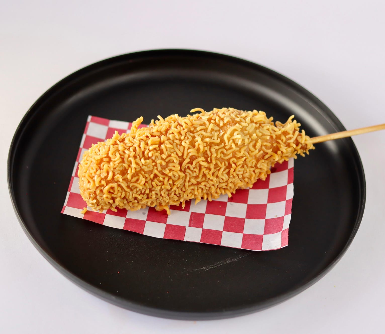Banderilla coreana rellena de puro queso gouda cubierta de ramen.