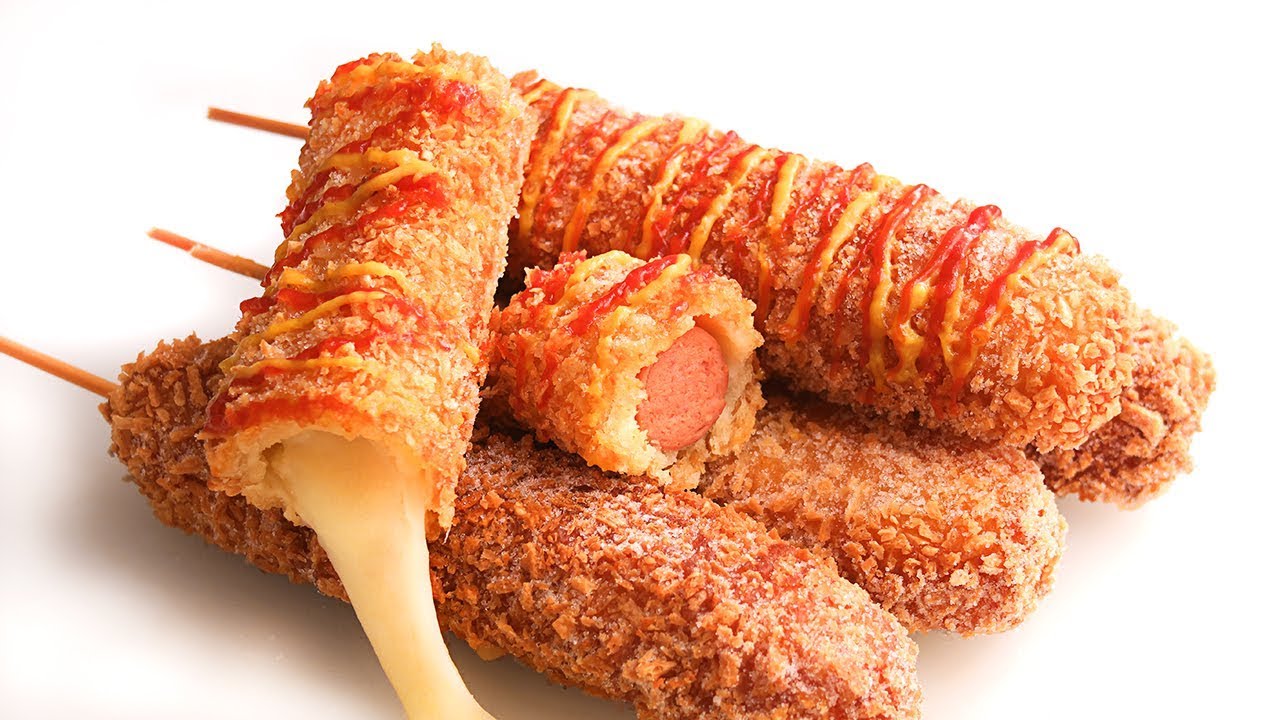 Banderilla coreana con relleno de salchicha y queso cubierta de panko.