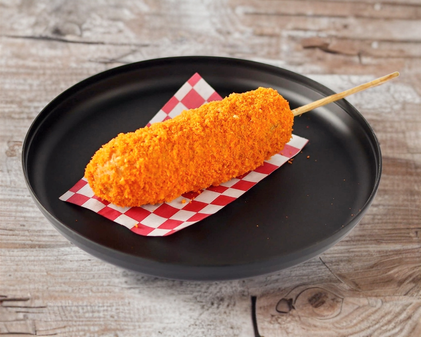 Banderilla coreana rellena de puro queso gouda cubierta de panko y Cheetos queso.