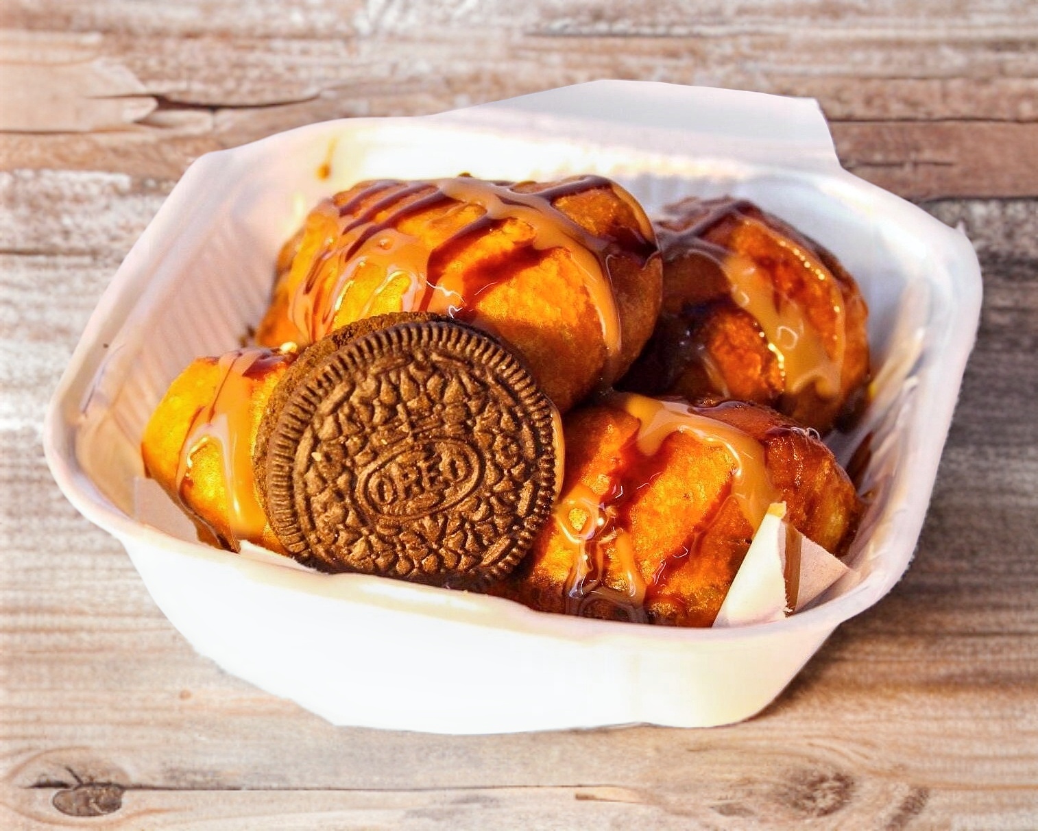 6 piezas de galleta oreo cubiertas con masa especial y fritas, además cubiertas con chocolate Hersheys.