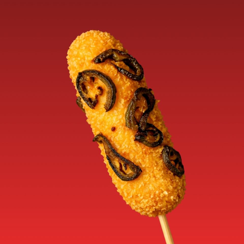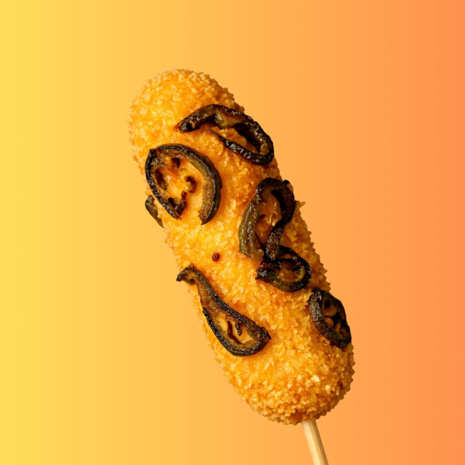 Banderilla rellena de queso, acompañada de delicioso topping de Jalapeño