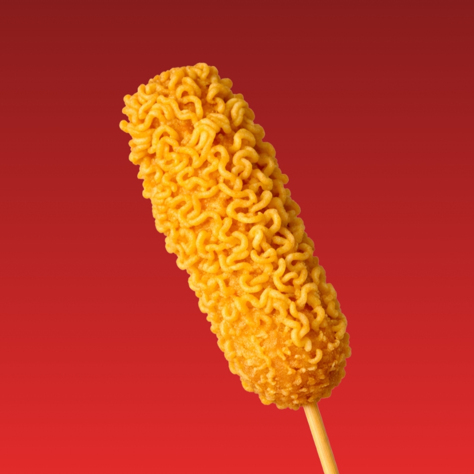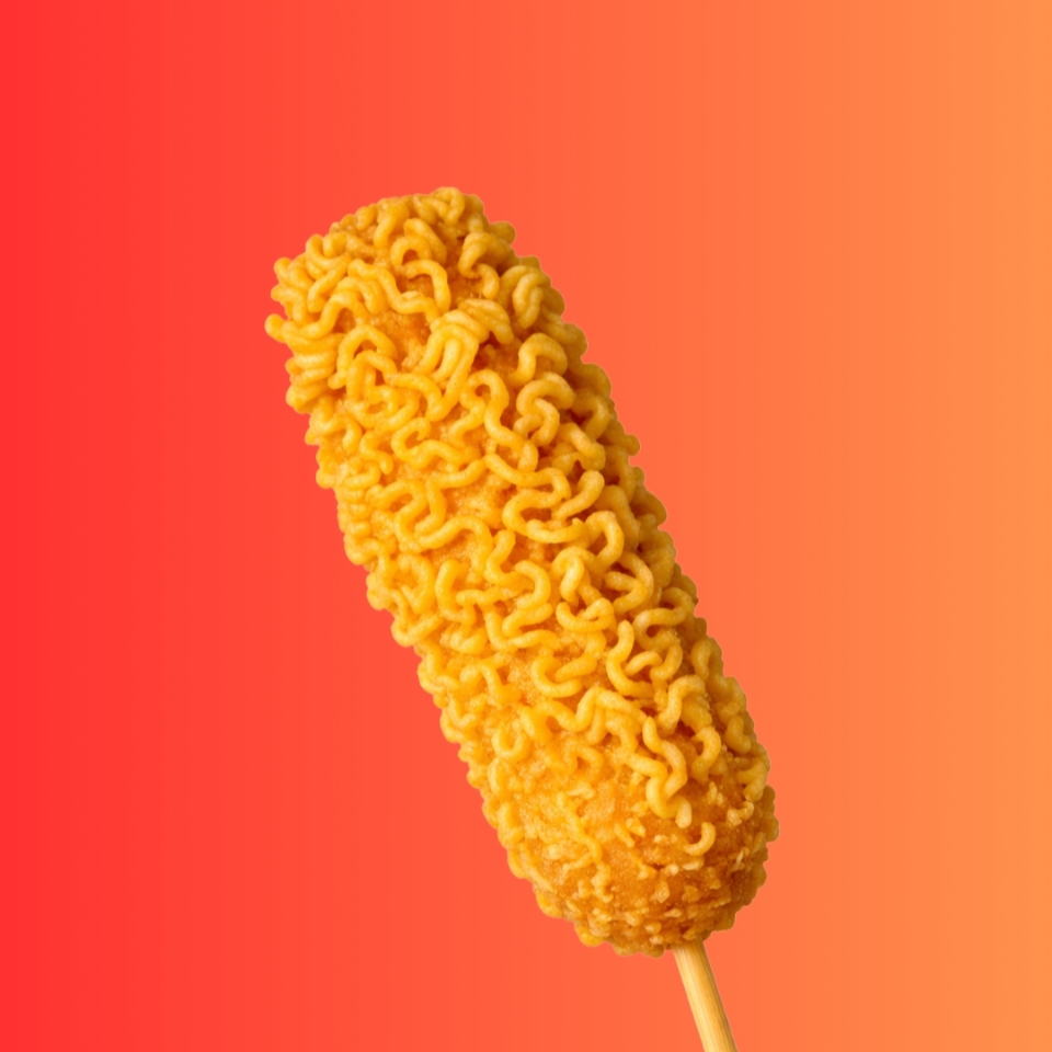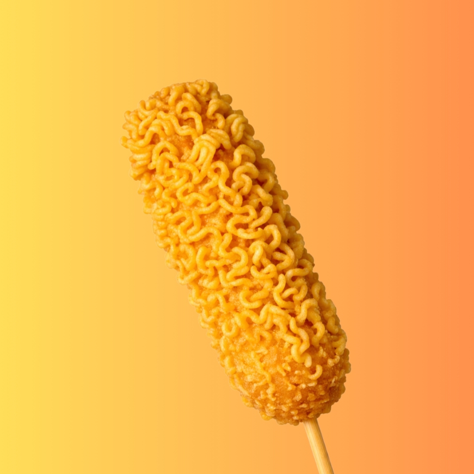 Banderilla rellena de salchicha y queso, acompañada de delicioso topping de Ramen