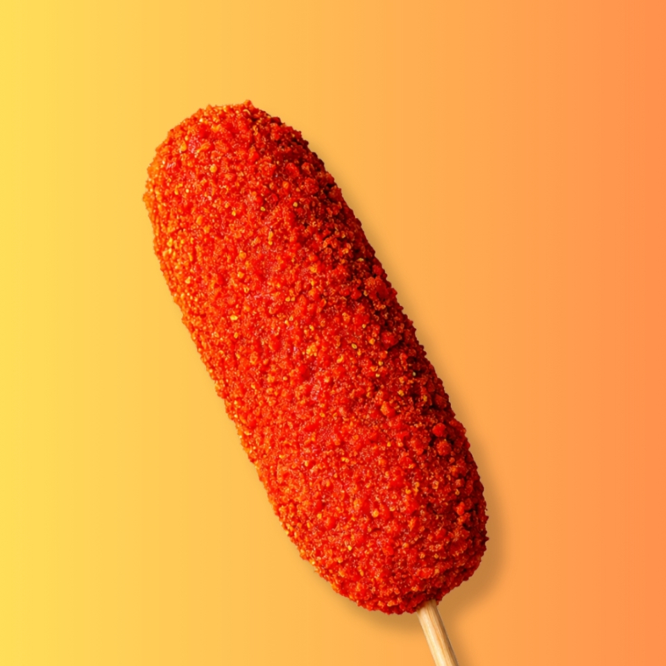 Banderilla rellena de queso, acompañada de delicioso topping de Cheetos Flamint Hot