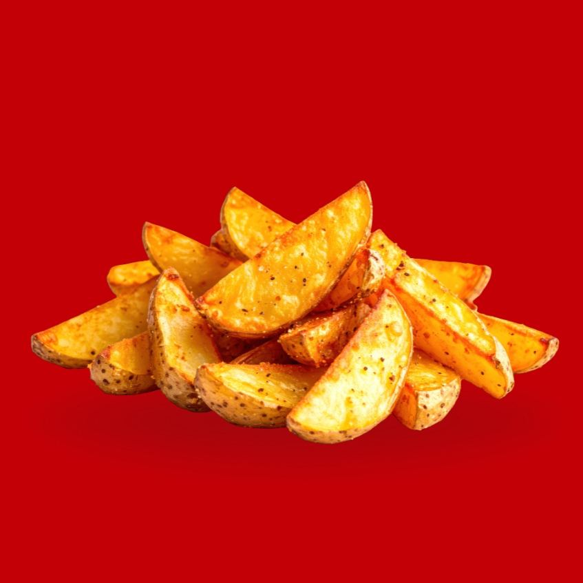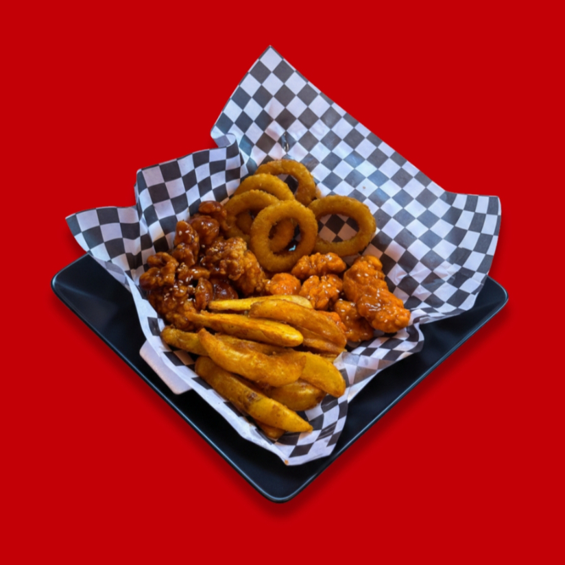 Incluye boneless crujientes, papas gajo doraditas y aros de cebolla recién fritos.