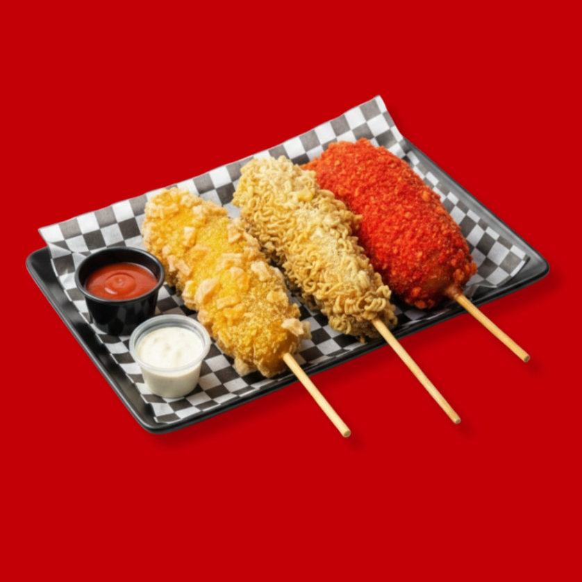 Incluye 1 banderilla coreana, papas a la francesa y tu bebida coreana favorita. Escríbenos por mensaje para elegir tus topping de tu banderilla.