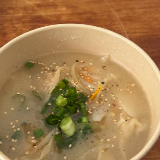 Sopa de empanada coreana de la casa. Caldo de res con verduras, mandu y servimos con arroz al vapor.
