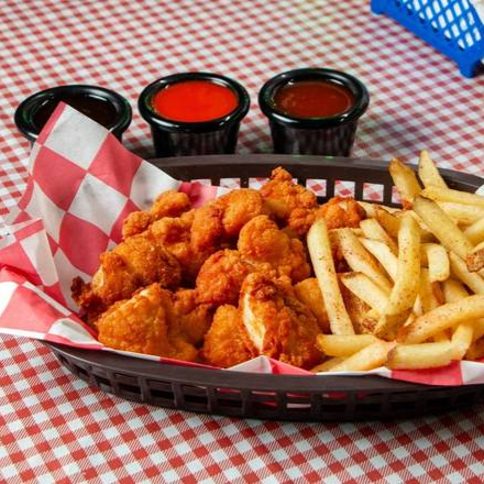 Hamburguesa con pollo empanizado bañado en salsa buffalo (opcional), queso y vegetales + Papas a la Francesa + bebida