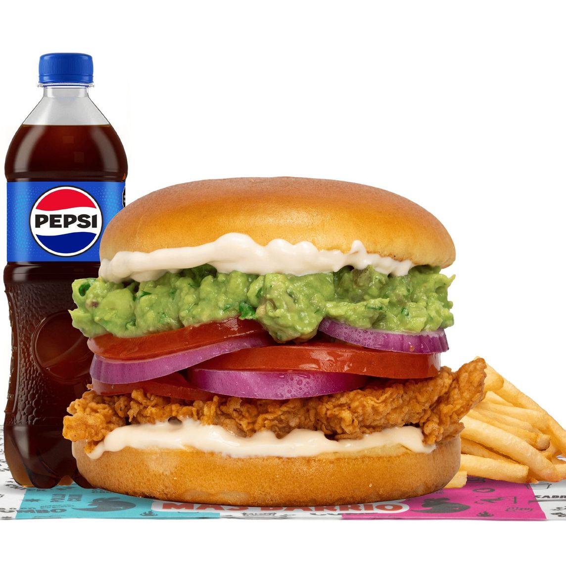 Hamburguesa de Pollo, Jitomate, Guacamole, Cebolla Morada y Mayonesa + Papas + Bebida.