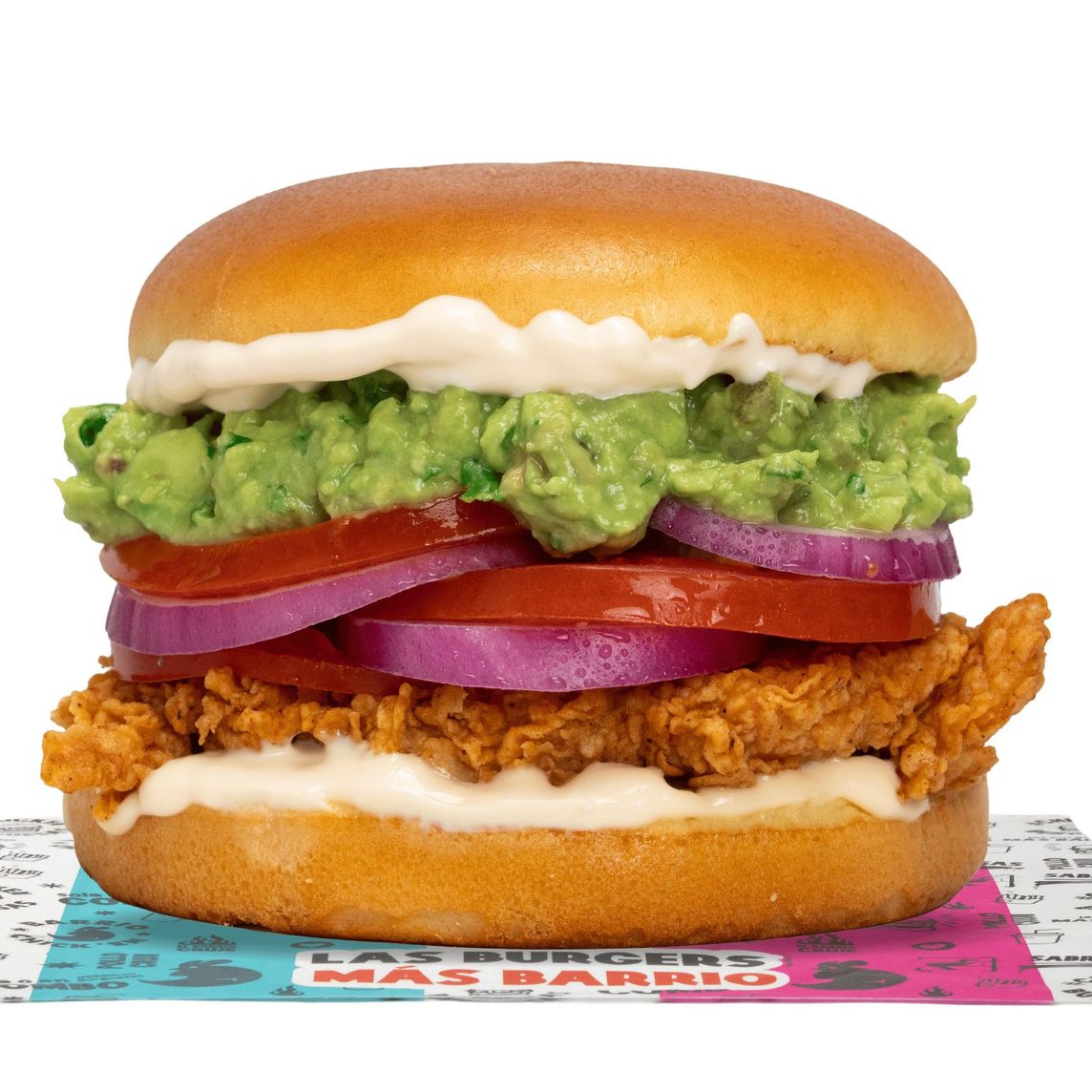Hamburguesa De Pollo Con Jitomate, Guacamole, Cebolla Morada y Mayonesa.
