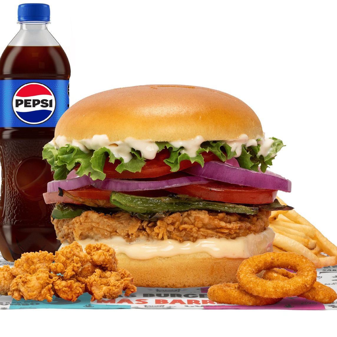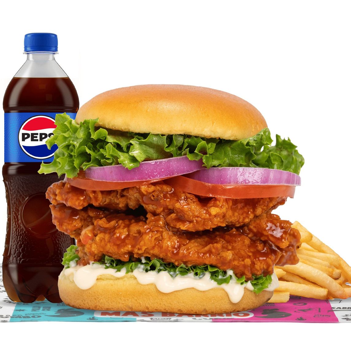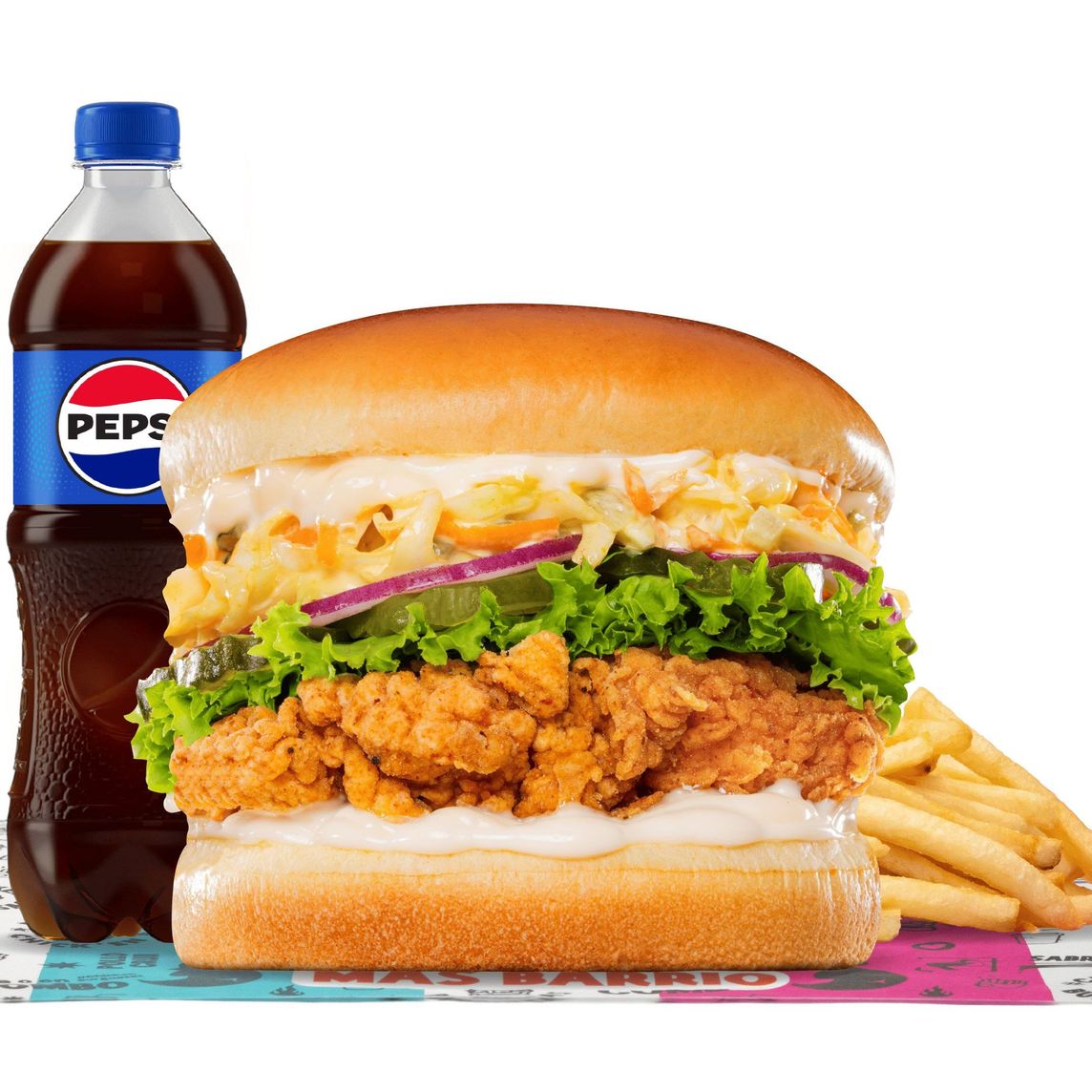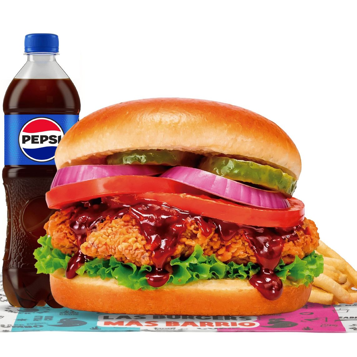 Hamburguesa de pollo crispy, lechuga fresca, jitomate, cebolla, pepinillos y un toque de aderezo con salsa Buffalo + papas fritas y refresco.