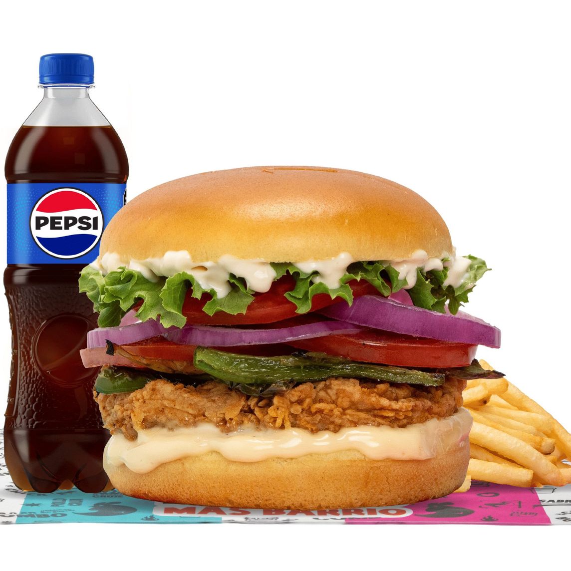 Hamburguesa de Pollo Con Salsa Habanero, Serrano Asado, Jitomate, Pepinillo, Lechuga y Cebolla Morada + Papas + Bebida.