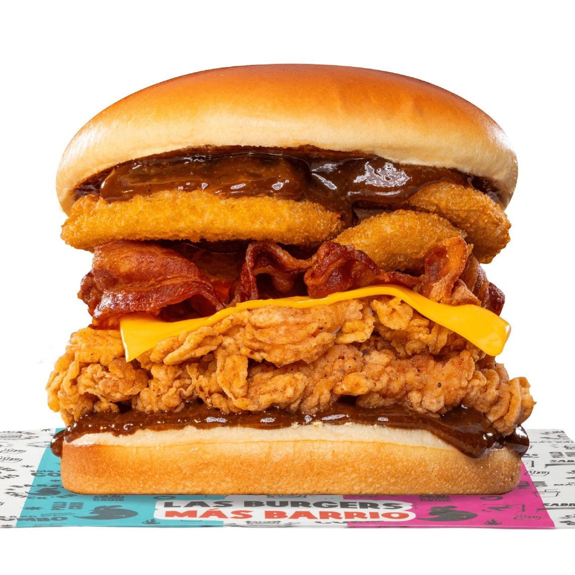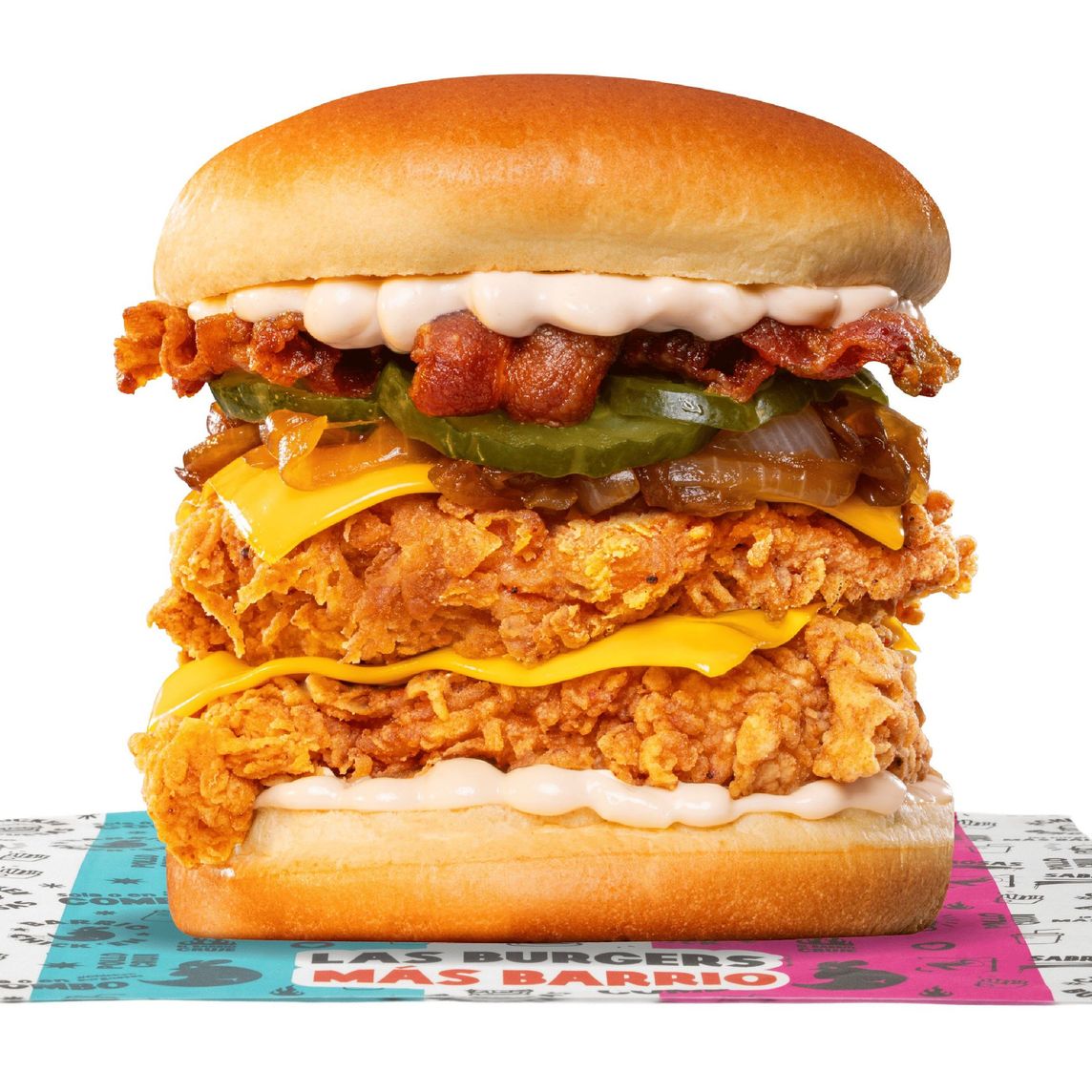 Doble Pollo Crispy con Queso Cheddar, Cebolla Caramelizada, Tocino, Pepinillos y Salsa Ahumada