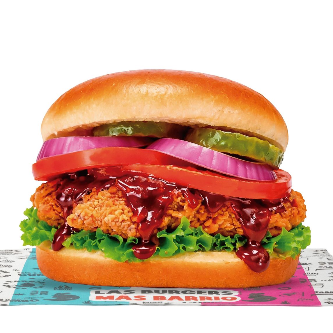 ChickenBurguesa 100% pechuga de pollo, con salsa koreana, jitomate, pepinillos, lechuga y cebolla morada.