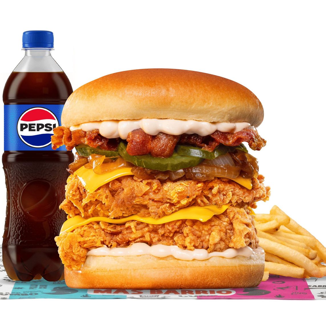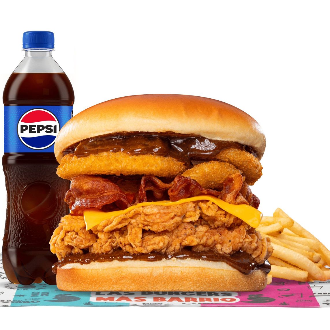 Hamburguesa Doble Pollo Crispy con Queso Cheddar, Cebolla Caramelizada, Tocino, Pepinillos + Papas y bebida