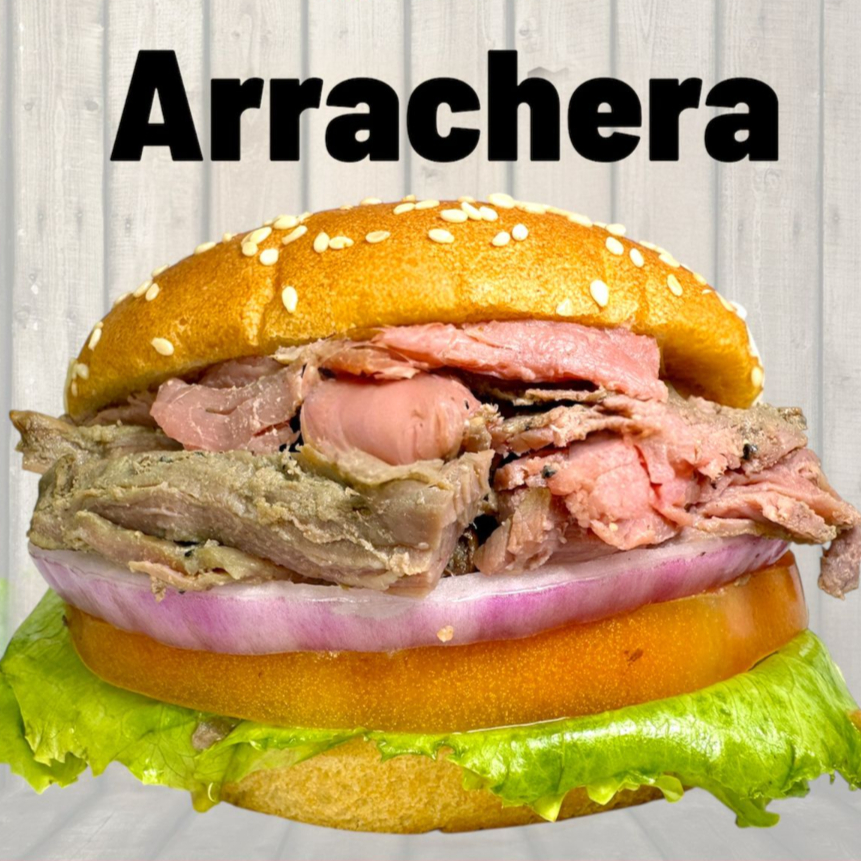 Hamburguesa con 200 gr de carne, extra arracherra, cebolla guisada, tocino y queso amarillo.