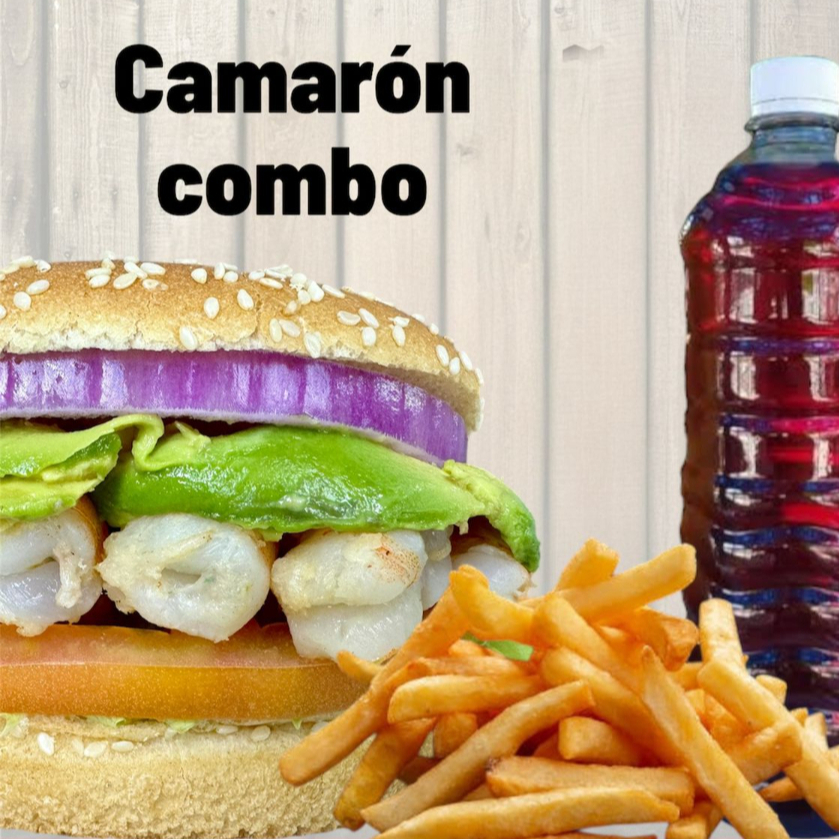 Hamburguesa Camaron mas 80gr de papas y bebida