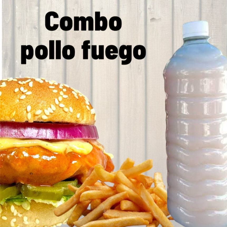 Hamburguesa Fuego mas 80gr de papas y bebida