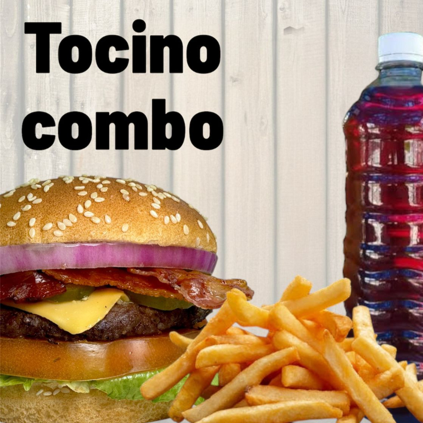 Hamburguesa Tocino mas 80gr de papas y bebida