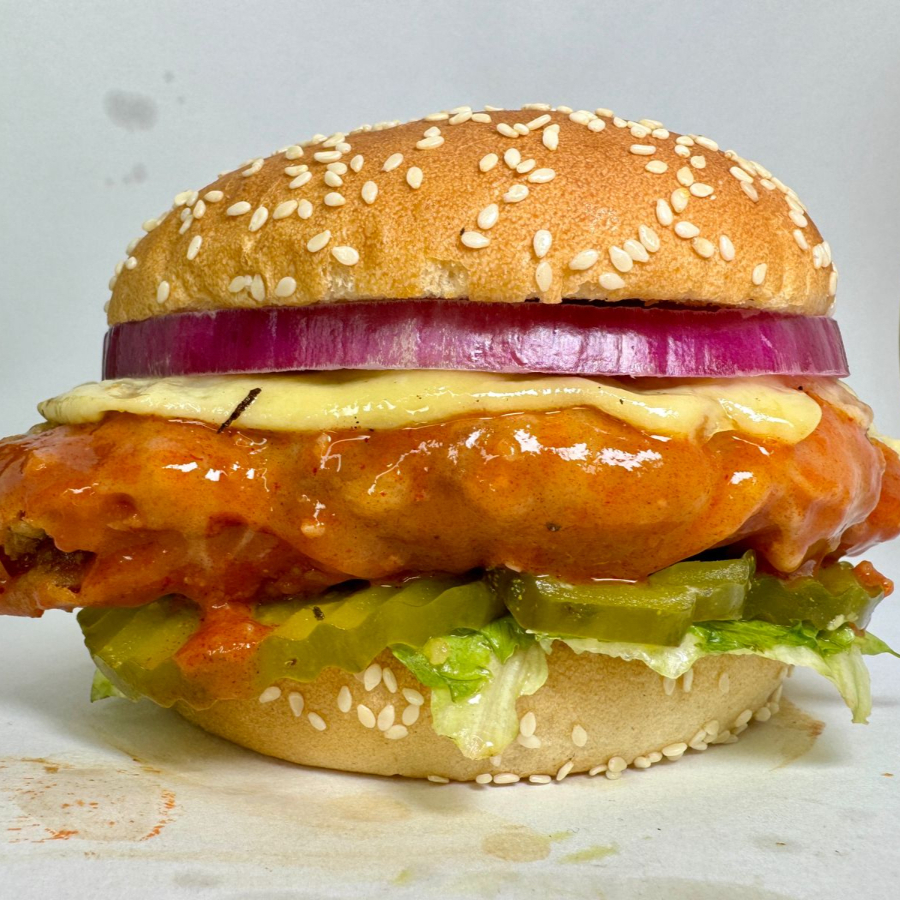 Hamburguesa con Pollo bañado en salsa búfalo
