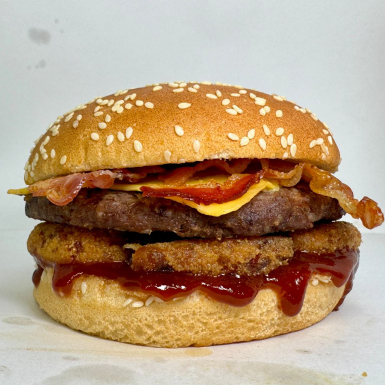 Hamburguesa con 200 gr de carne, aros de cebolla, tocino, cebolla guisada, queso amarillo, salsa bbq y ranch.