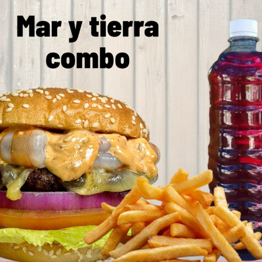 Hamburguesa Mar y tierra mas 80gr de papas y bebida