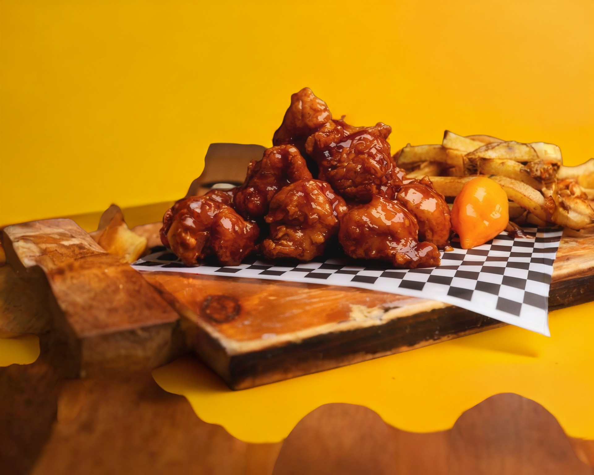 1/2 Kilo en crudo de boneless bañados en una exquisita salsa búfalo mantequilla, con una porción de papas a la francesa gratis.