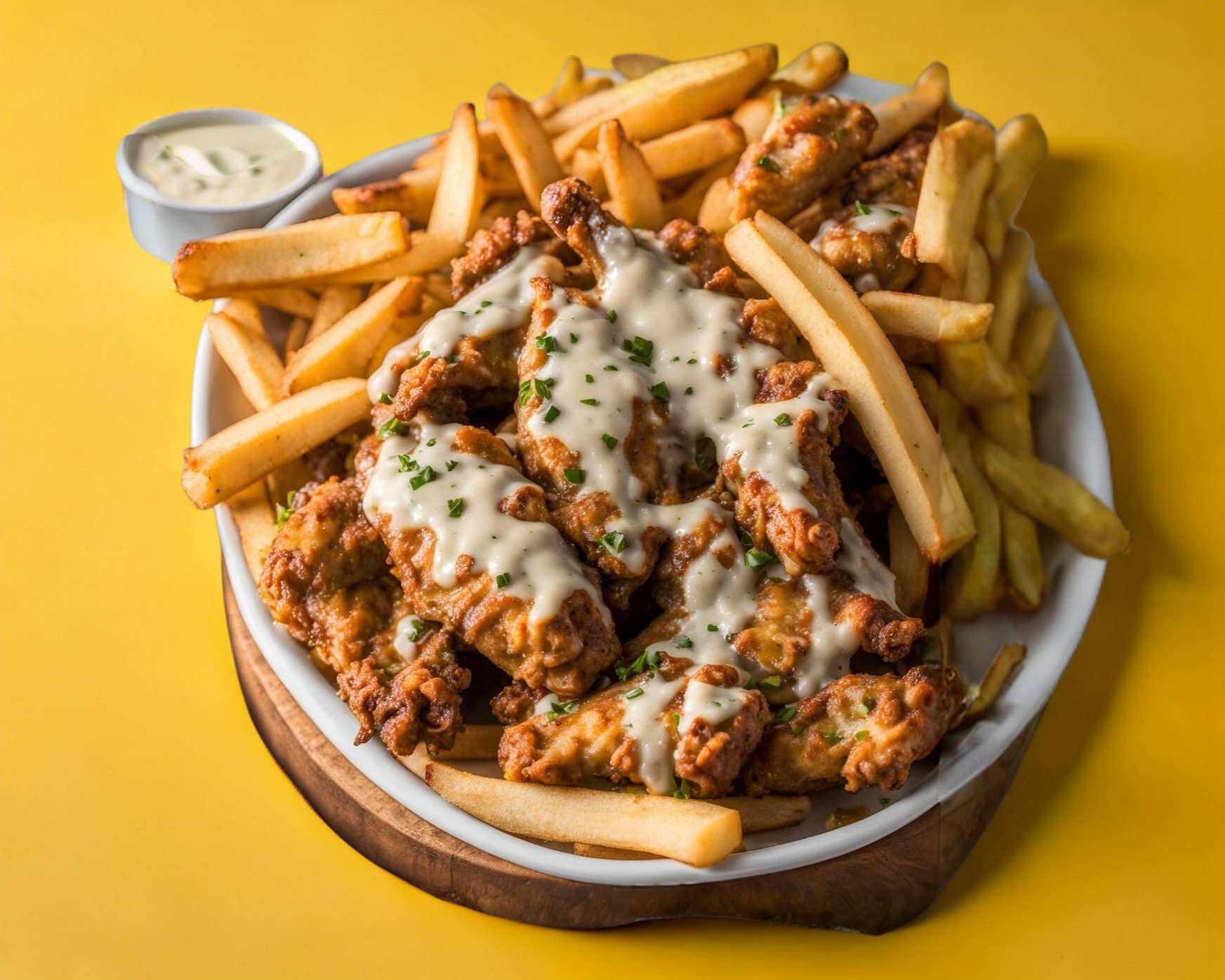 1/2 kg En crudo de boneless jugosos bañados en una deliciosa salsa de parmegiano con ajo y va con una porción de papas a la francesa gratis.