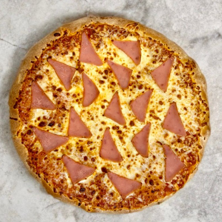 Pizza Grande con jamón, chorizo y salchicha americana.