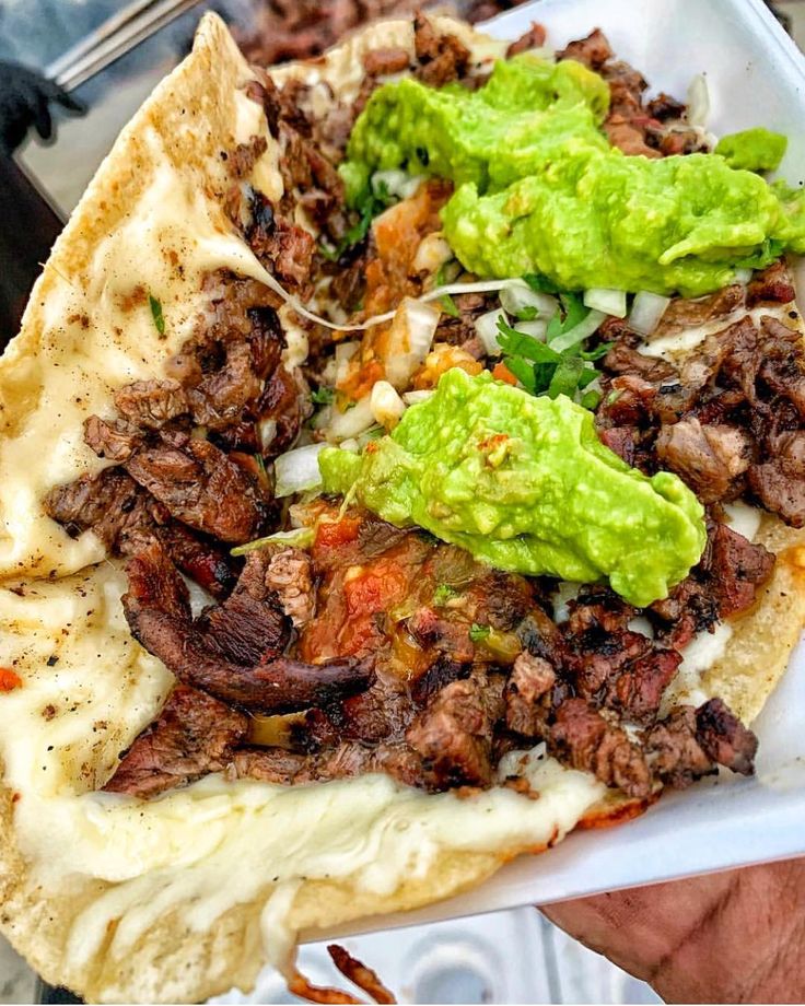 Tortilla de harina enorme de 32cm con bistec, queso, incluye salsa, cebolla, cilantro y limon. Super llenona