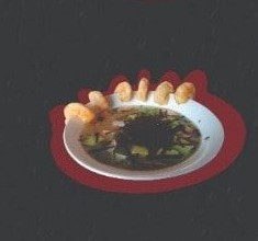 Consome de soya oriental con fideo (herosamen), tofu, champiñones, cebollín Y 6 camarones capeados.