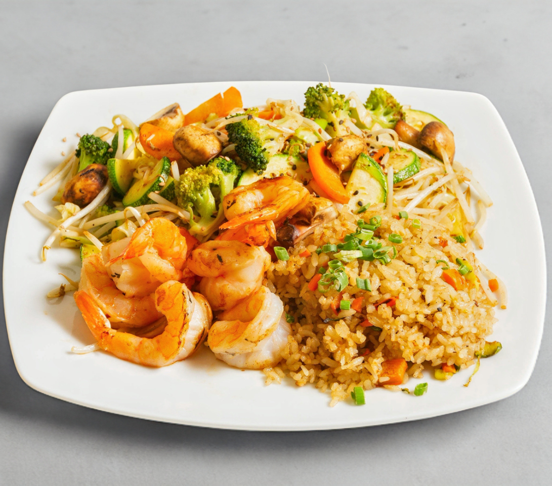 Verduras a la plancha, con arroz frito acompañas con pollo res y camaron