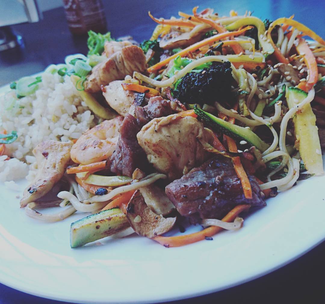 Arroz frito con aguacate, queso Philadelphia, ensalada Tampico y carnes mixtas pollo, res y camarón