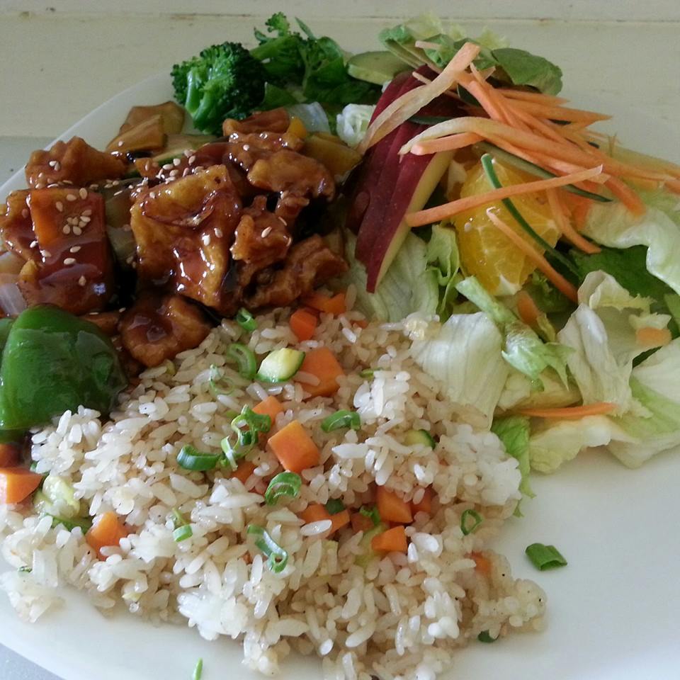 Pollo a la naranja (250grs) acompañado de ensalada fresca y arroz frito