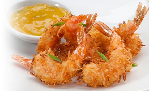 Camarones 6Pz. empanizados con coco, bañados en crema de coco acompañados de arroz frito y ensalada fresca.