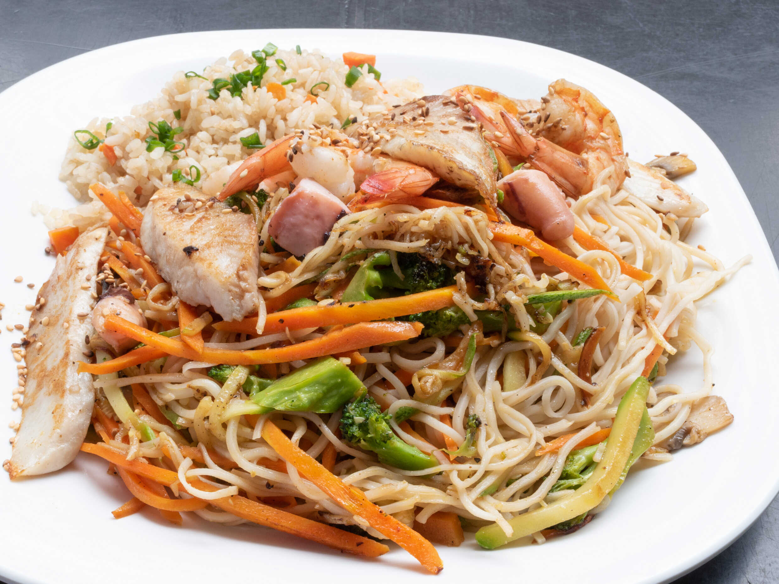 verduras a la placha con pasta soba de trigo con toque de ajonjolí, acompañado de arroz frito.