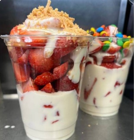deliciosas fresas picadas con crema bionico y cereal. tamaño vaso 12 oz.