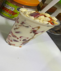 Vaso de 1/2, elige 3 cereales de tu preferencia: Mini kiss, granola, pasas, paletero, amaranto, coco horneado, coco blanco, lunetas, cacahuate, nuez, granillo de colores, arroz inflado