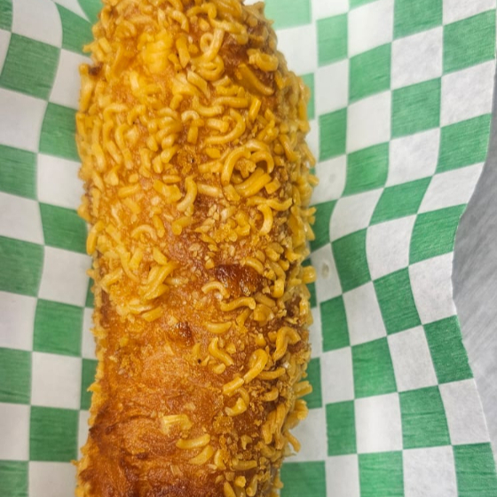 Banderilla de salchicha y queso por dentro, con ramen por fuera.