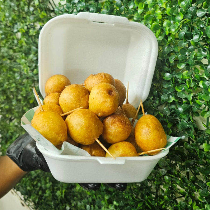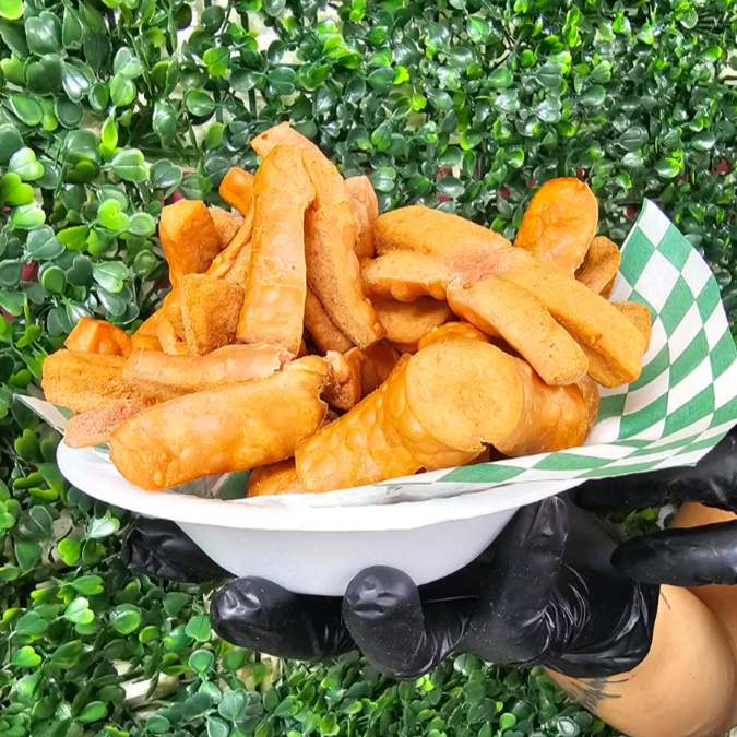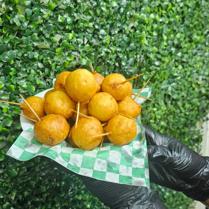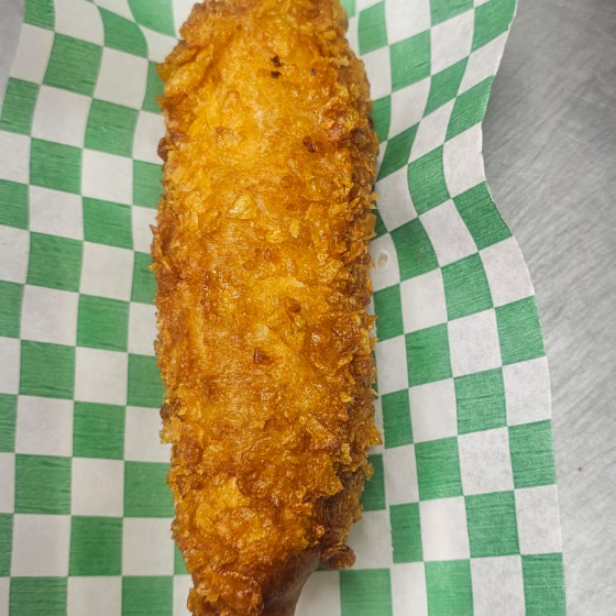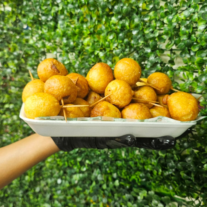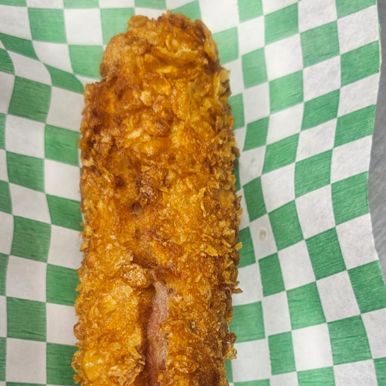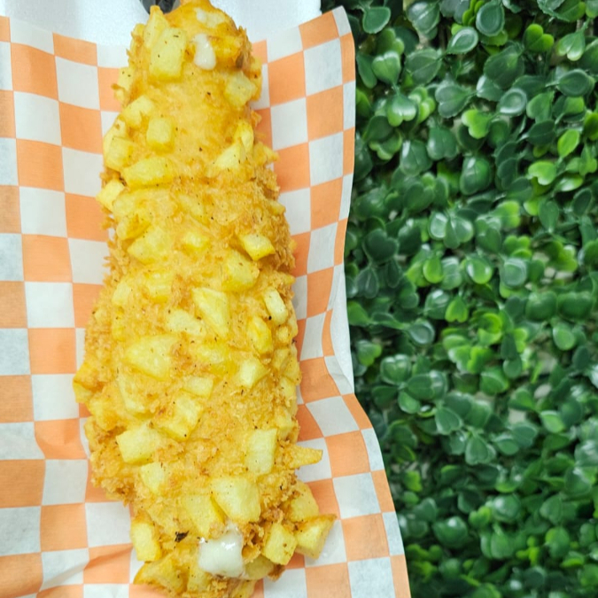 Banderilla de salchicha y queso por dentro, con papa por fuera.