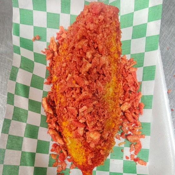 Banderilla de salchicha y queso por dentro, con takis por fuera