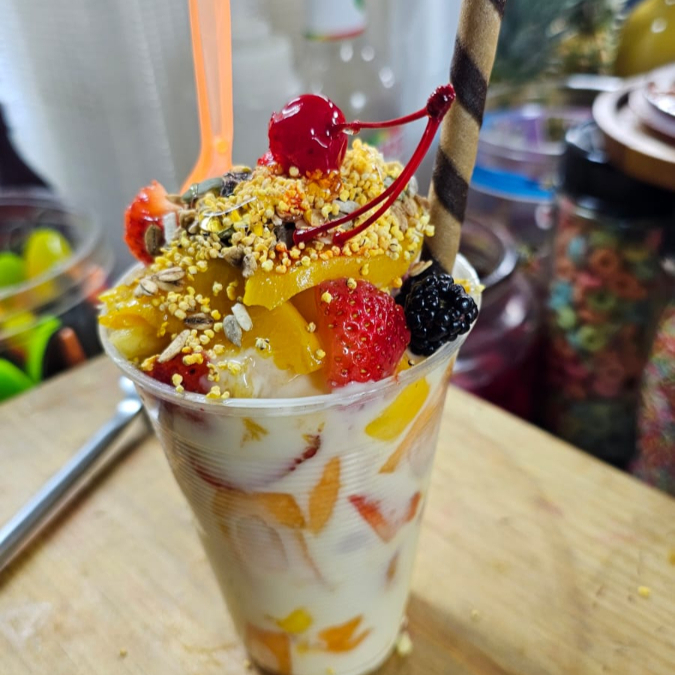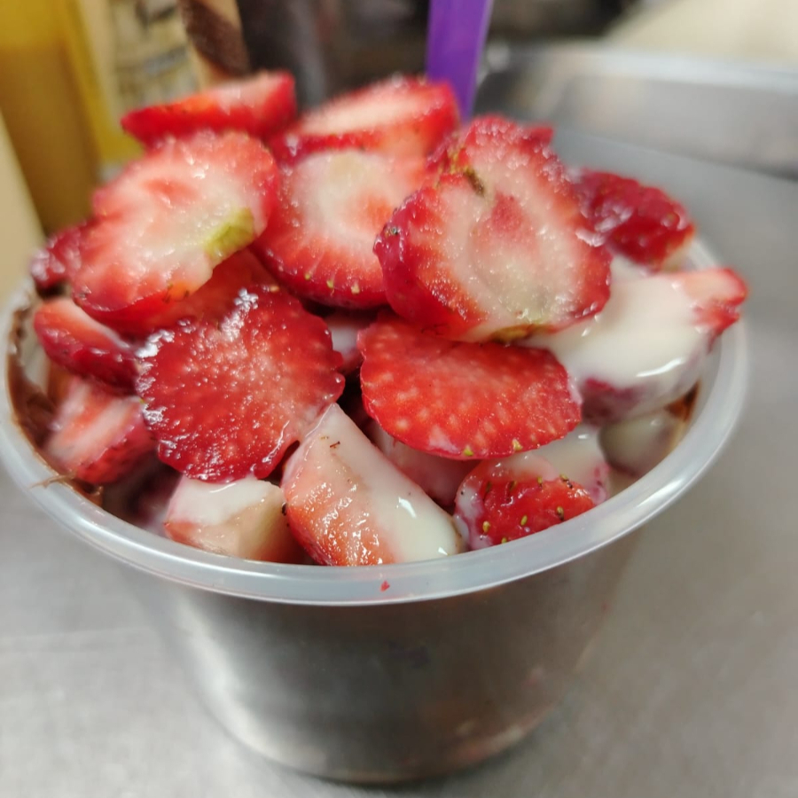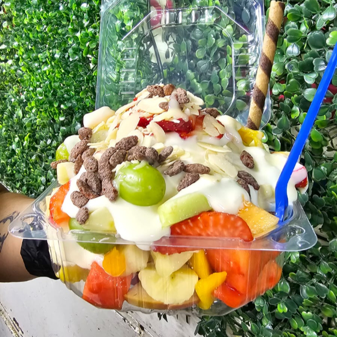 biónico con fruta de temporada minimo 4 frutas a elejir 3 topings a elejir crema o yogurt (fresa, durazno y natural)