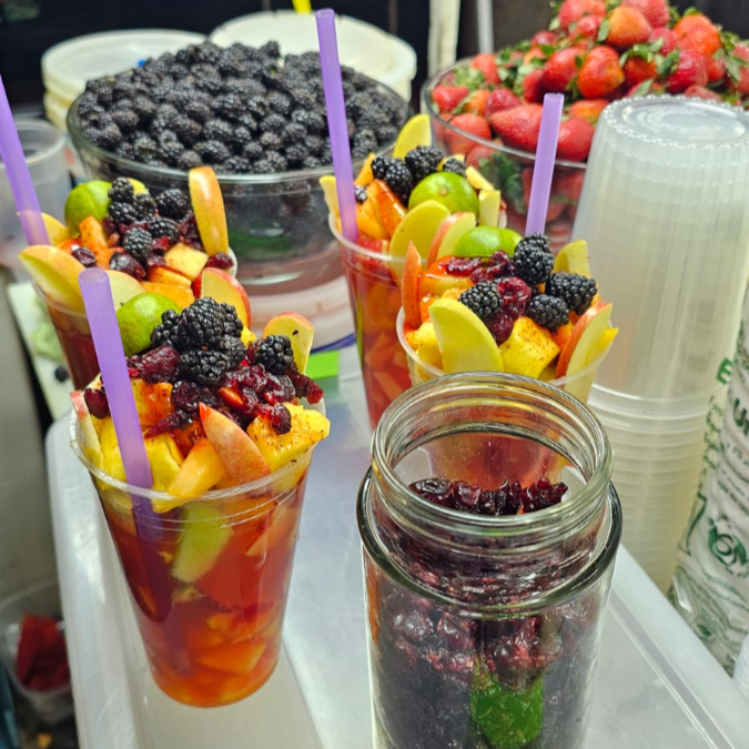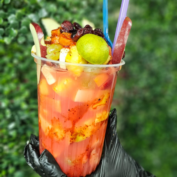 Fruta con jugo de naranja vaso escarchado con chamoy y tajin con toda la fruta acompañado con arándanos y ganadina