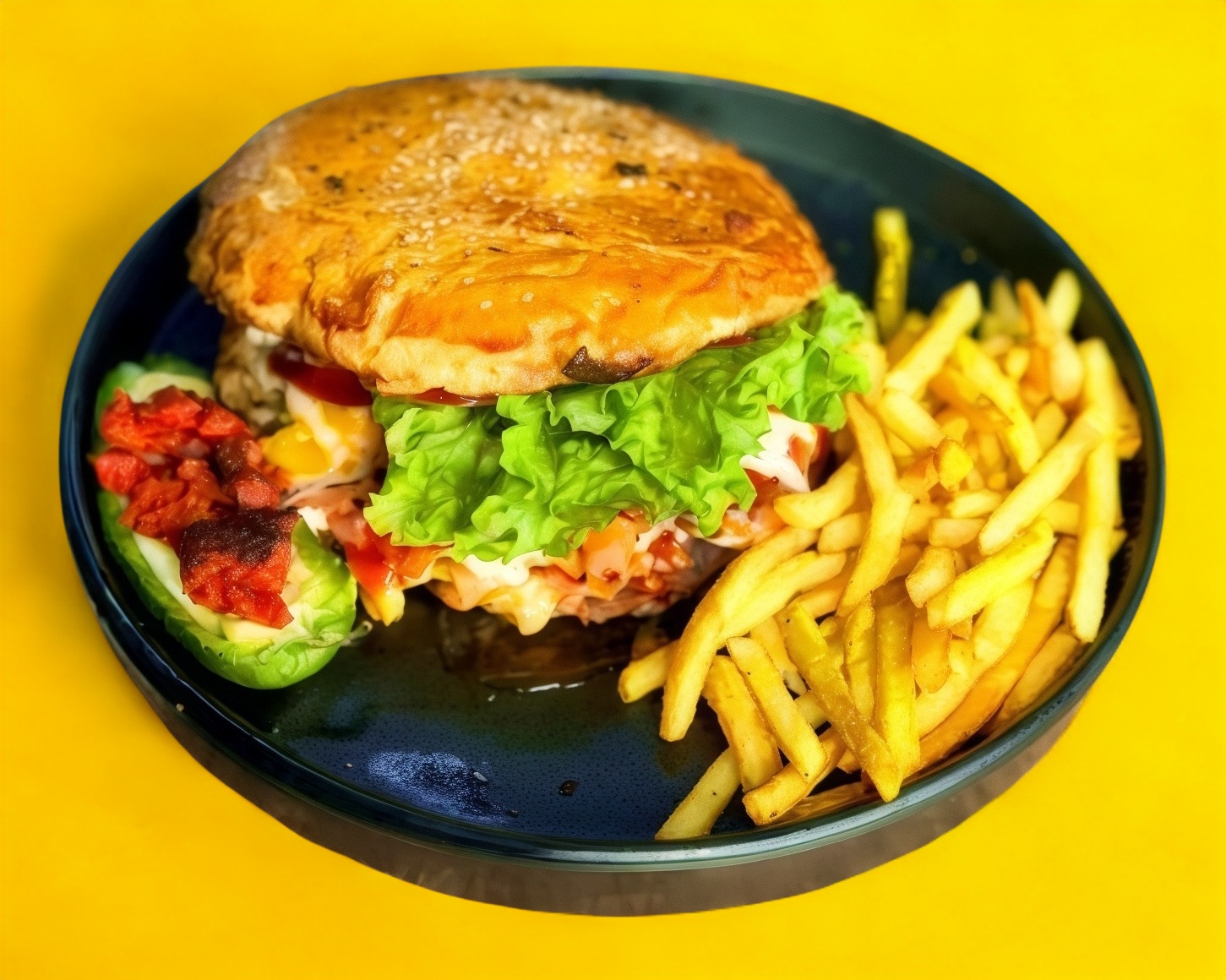 250.gramos de carne de res, Jamón, Queso amarillo y manchego Cebolla guisada Tocino Lechuga Jitomate, Con papas a la francesa.