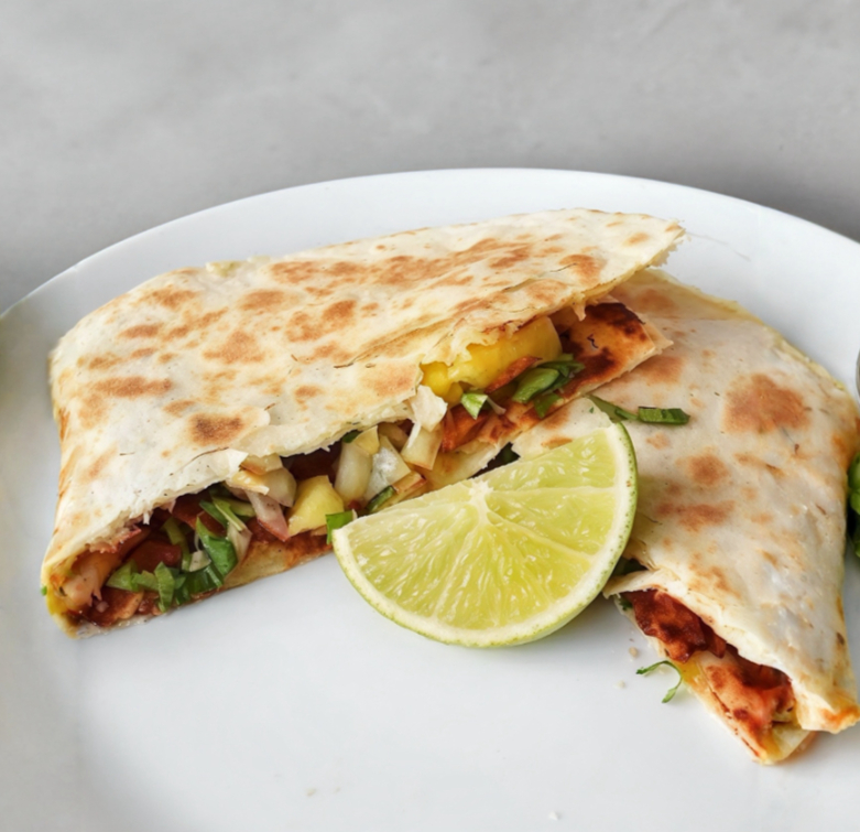Dos tortillas de harina con queso fundido, acompañado de deliciosos chorizo y verduras.