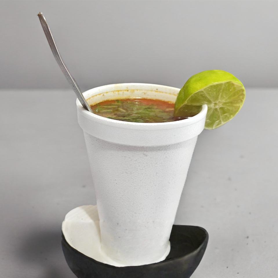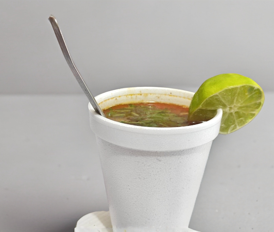 1/2 Litro de consomé de la birria, acompañado de salsa y verduras.