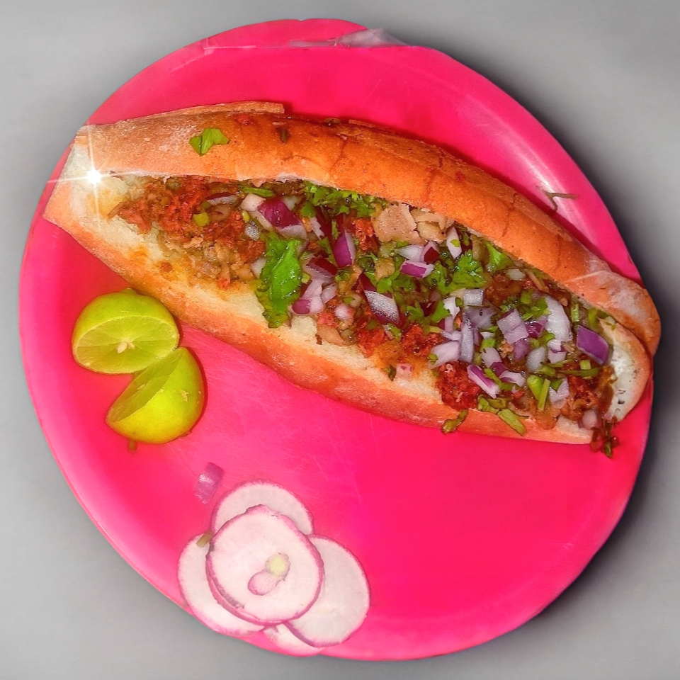 Delicioso lonche de chorizo, acompañado con queso fundido, cebolla, cilantro y sus salsas.