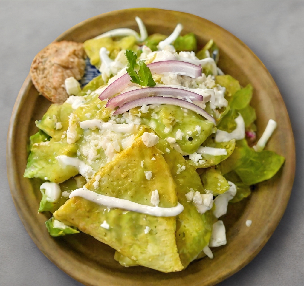 Chilaquiles verdes, acompañados de queso crema, cebolla, cilantro y aguacate. Favor de indicar si no gusta de algún ingrediente.